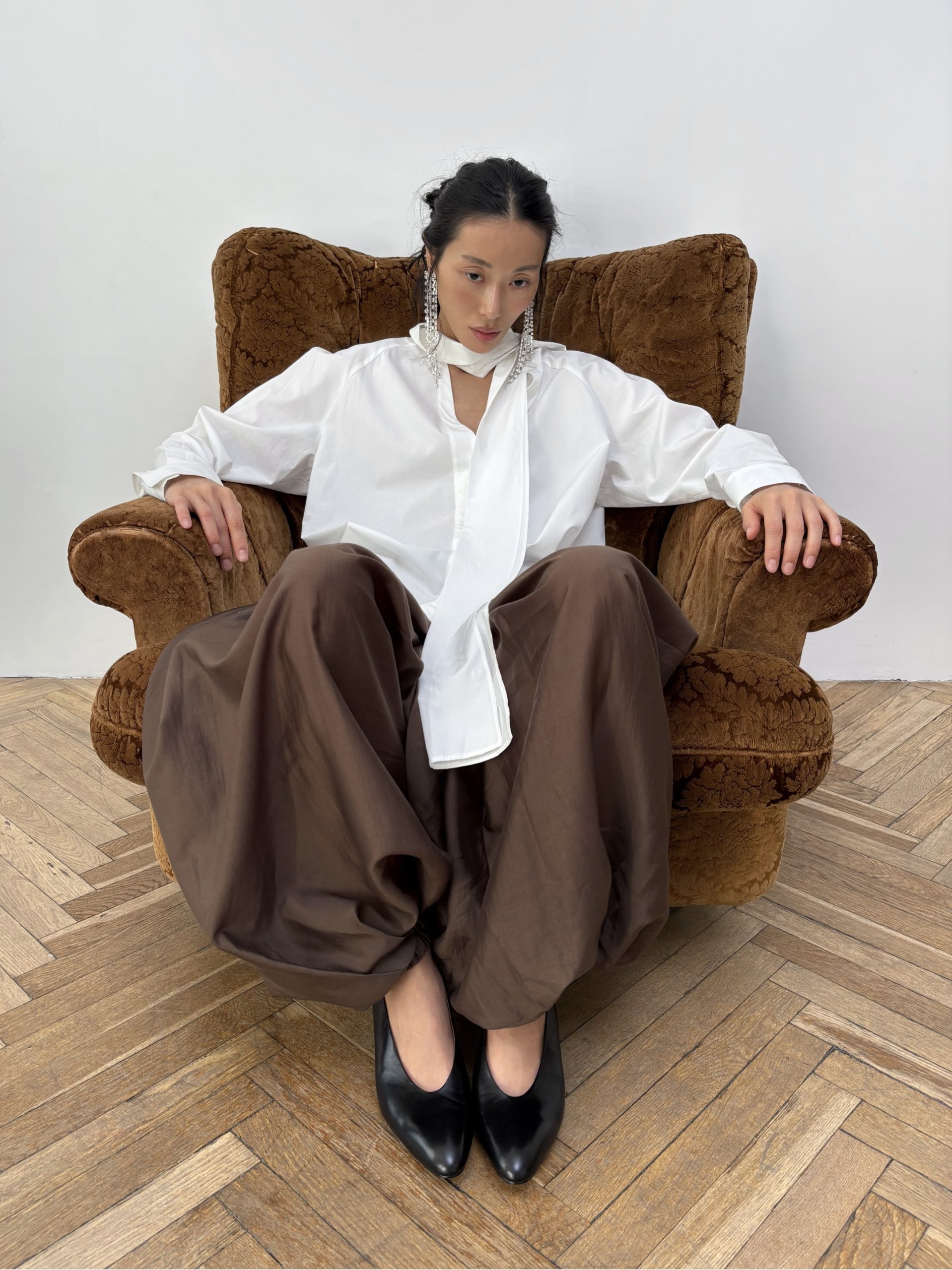 13900 ₽Рубашка Bow выполнена из плотного хлопка в белом оттенке. Рубашка имеет свободный силуэт, рукава реглан и центральную супатную застежку на пуговицы. Главная деталь данной модели – воротник – стойка, которая продолжается в длинный шарф. Параметры модели: рост — 175 см, обхват груди — 83 см, обхват талии — 68 см, […]