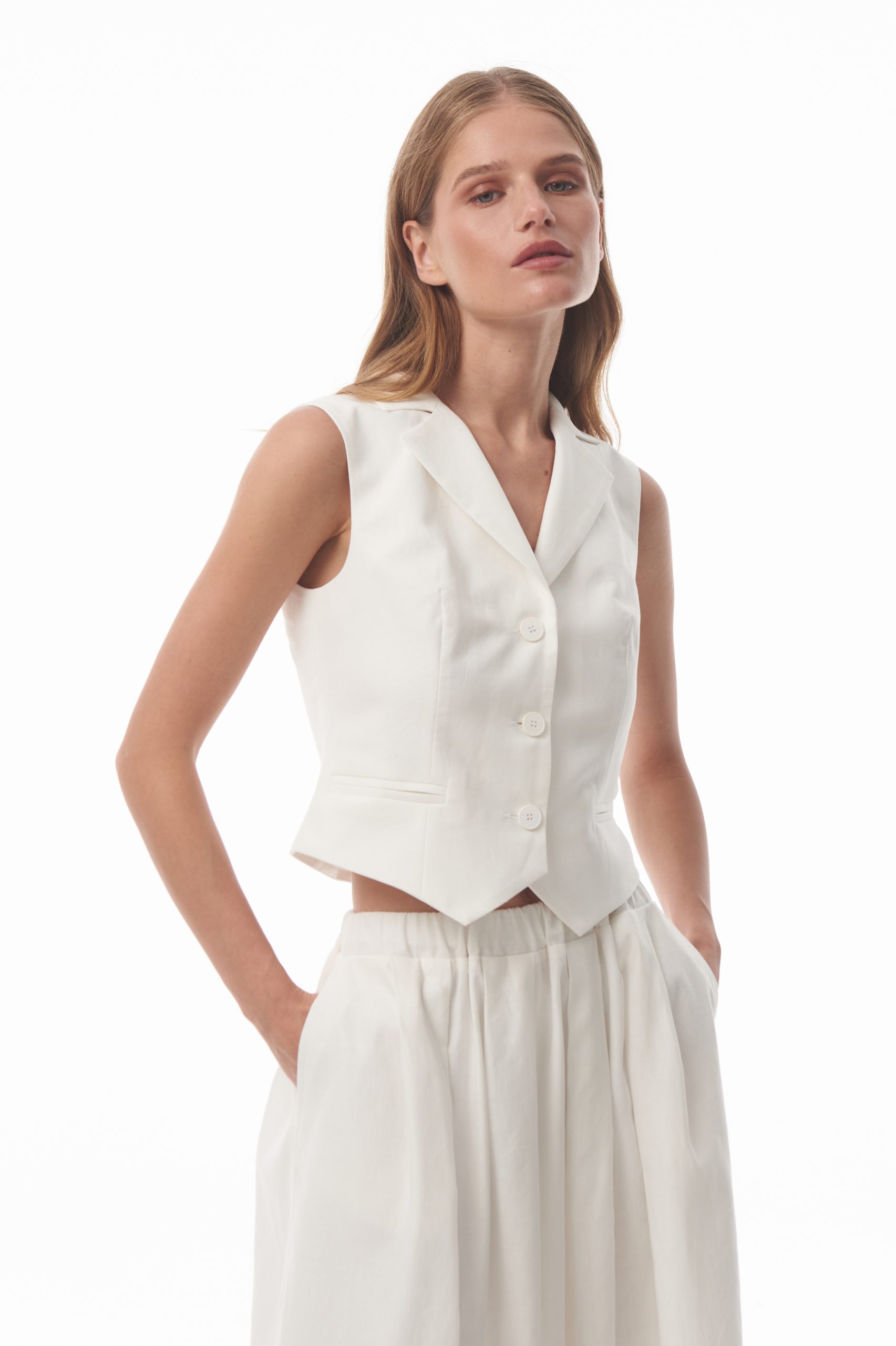 Жилет “Lovely Day” полуприлегающего силуэта с лацканами. Застежка центральная на 4 петли и 4 пуговицы. Нижний край борта со скошенными углами. Карман прорезной с листочкой с втачными концами. Спинка со средним швом и рельефами из проймы. Изделие выполнено из 100% льна и является идеальным выбором на лето. Сочетайте данный жилет с юбкой из одноименной серии Lovely Day и другими базовыми изделиями. Параметры модели: рост — 175 см, обхват груди — 83 см, обхват талии — 58 см, объём бёдер — 89 см. На модели размер S.