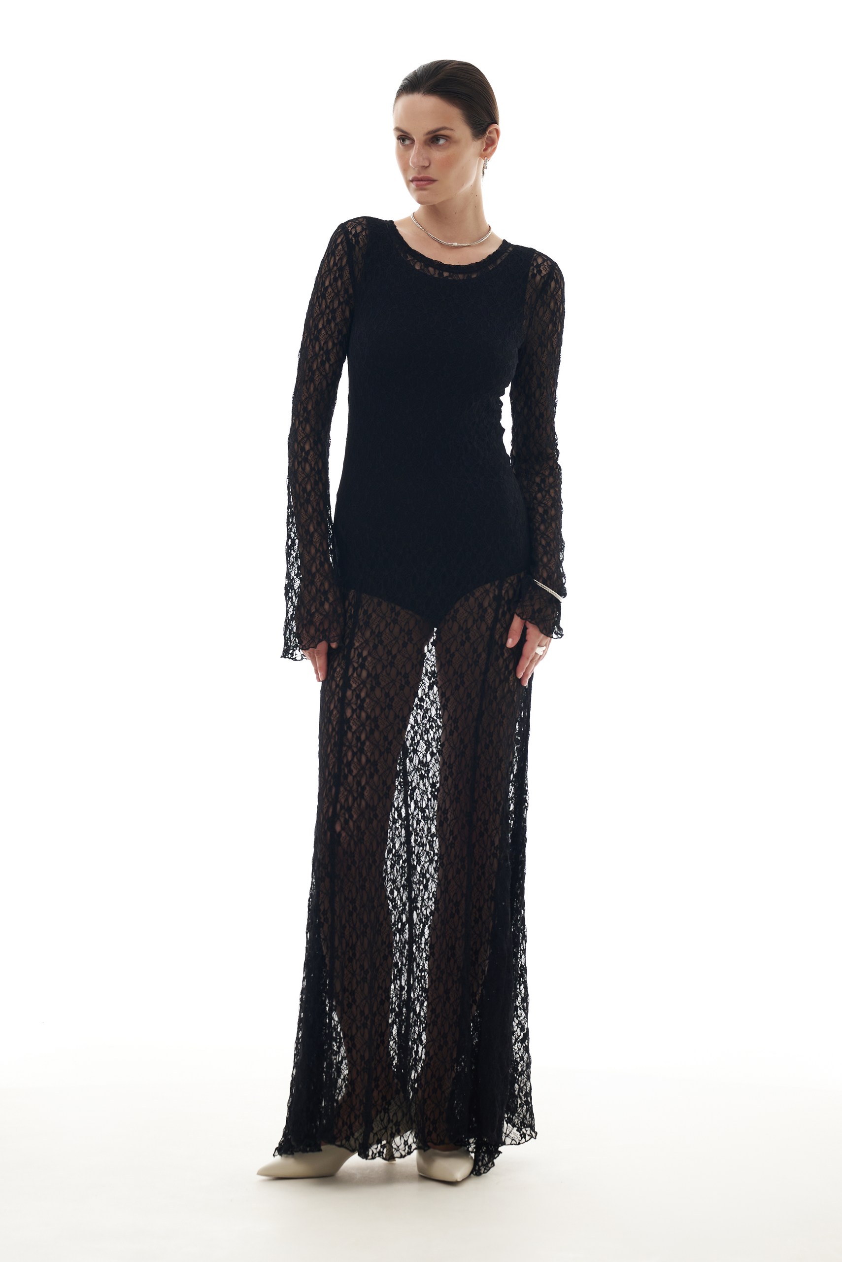 Платье прилегающего силуэта из эластичного кружева длиной макси. Рукав втачной одношовный длиной до запястья с умеренным расклешением. На уровне бедёр, по бокам – втачные клинья годе, которые создают расклешенный силуэт. Параметры модели: рост — 175 см, обхват груди — 78 см, обхват талии — 60 см, объём бёдер — 87 см. На модели размер S.