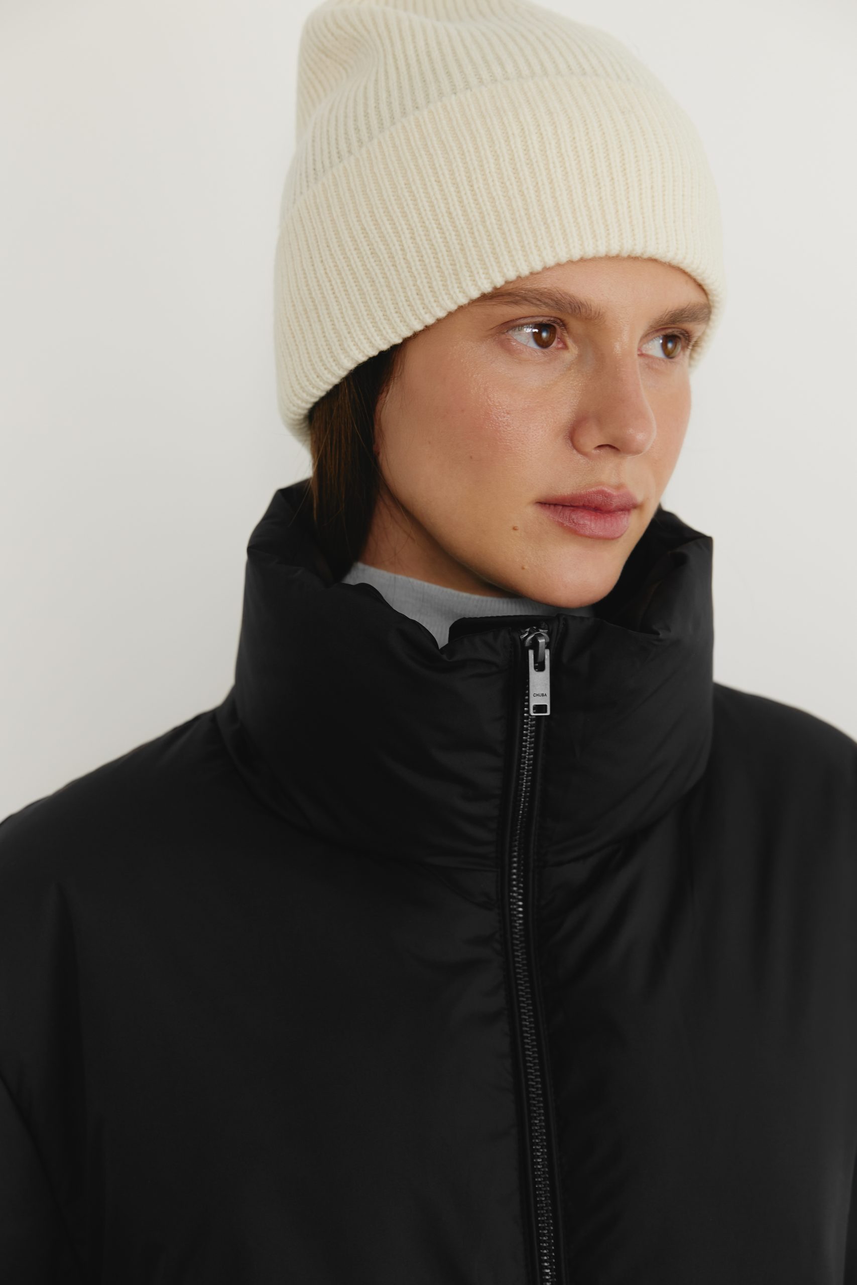 Пуховик Melting – универсальный свободный пуховик. Спущенная линия плеча позволяет носить его даже с объемным свитером, а вязаные манжеты из 100% шерсти комфортно прилегают к запястьям, сохраняя тепло. Для модели мы выбрали плотную матовую ткань, которая не пропускает снежинки и случайные капли. Наполнитель — отборный утиный пух, сохраняющий тепло до -15°C. Пуховик застегивается на двухзамковую металлическую молнию, а высокий воротник – стойка защищает от ветра.