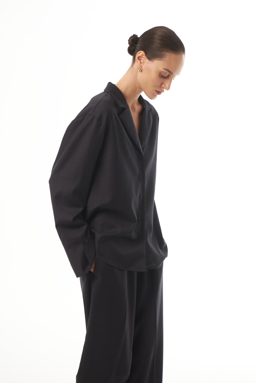 Рубашка “Monaсo” умеренного объёма с лацканами, длиной до линии бедер. Застежка центральная на 7 обметанных петель и 7 пуговиц. Спинка с кокеткой и складками. Рукав втачной, низ рукава обработан манжетой с застежкой на 1 обметанную петлю и 1 пуговицу. На левой манжете расположена вышивка в цвет основной ткани. Параметры модели: Рост 178, Обхват груди 84, Талия 59, Бедра 88