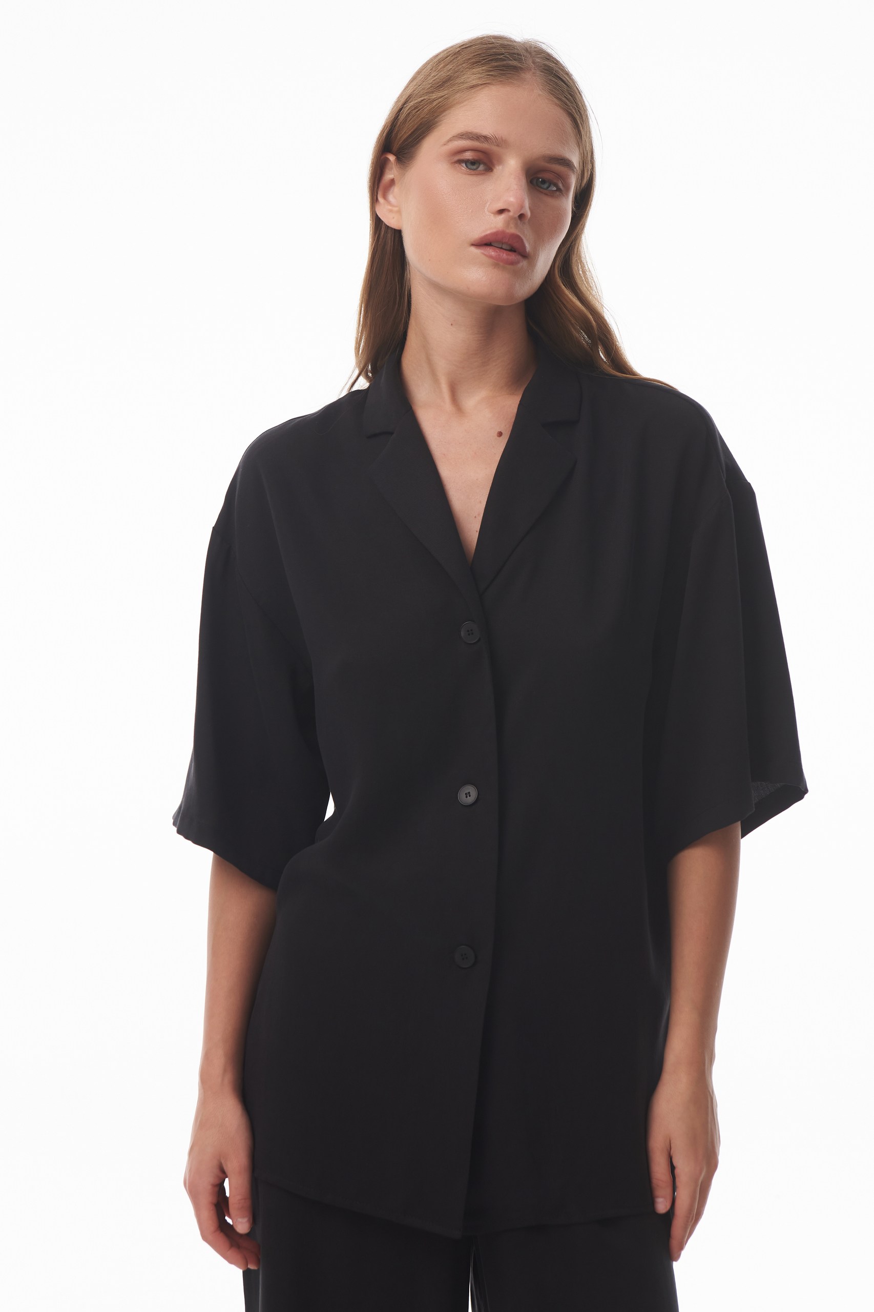 Рубашка с коротким рукавом свободного кроя с застежкой на 2 обметанные петли и 2 пуговицы. Воротник отложной пиджачного типа с отрезной стойкой. Изделие выполнено из качественной купры. Рубашка “Wave” отлично разнообразит повседневный гардероб. Параметры модели: рост — 175 см, обхват груди — 83 см, обхват талии — 58 см, объём бёдер — 89 см.